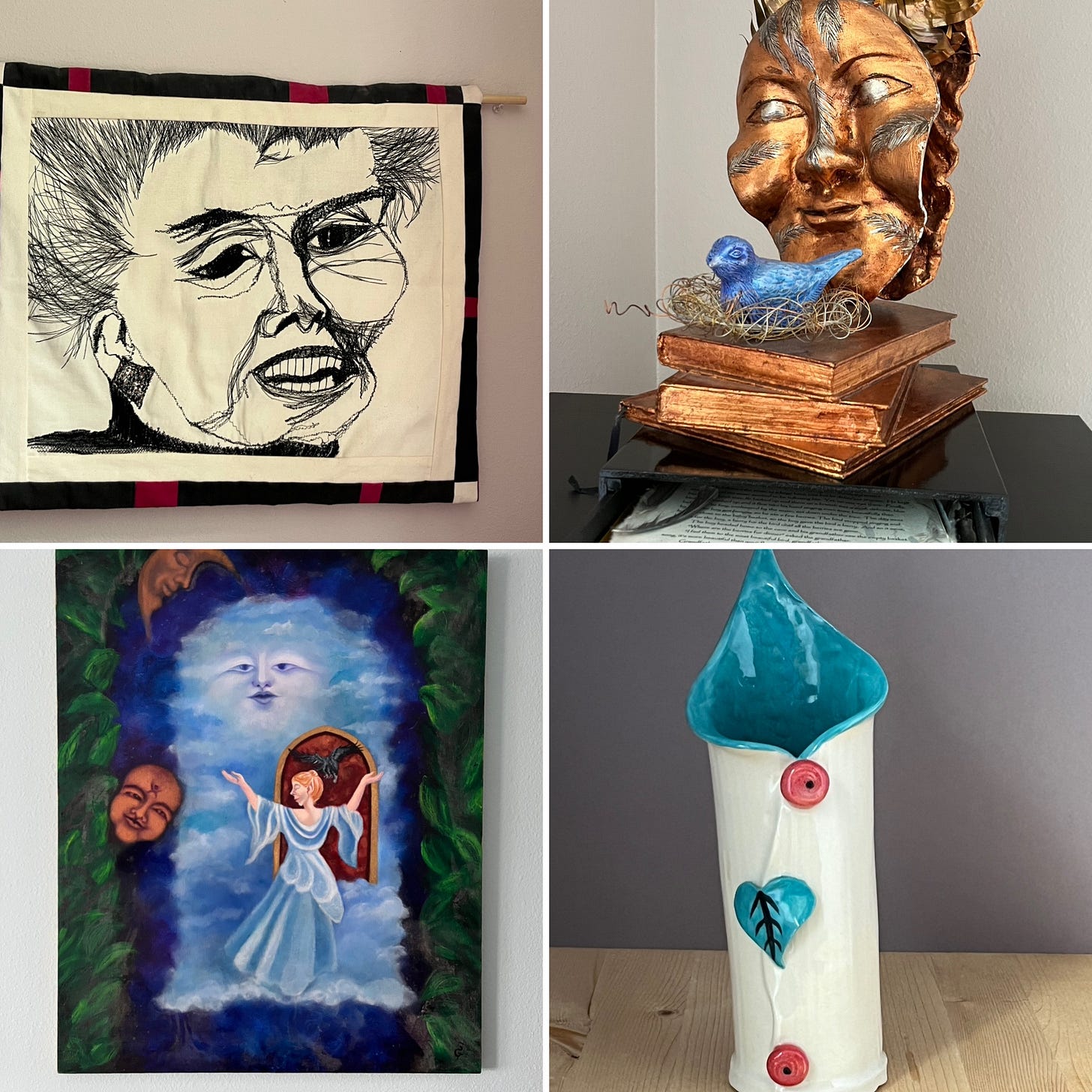 I’ve done a lot of different kinds of art over the years. Painting in watercolor, acrylics, oil and pastel. Fiber art including beaded embroidery, quilting and crochet. Clay sculpture. Copper repousse. Mixed media boxes that included clay, copper repousse and a story I wrote.
