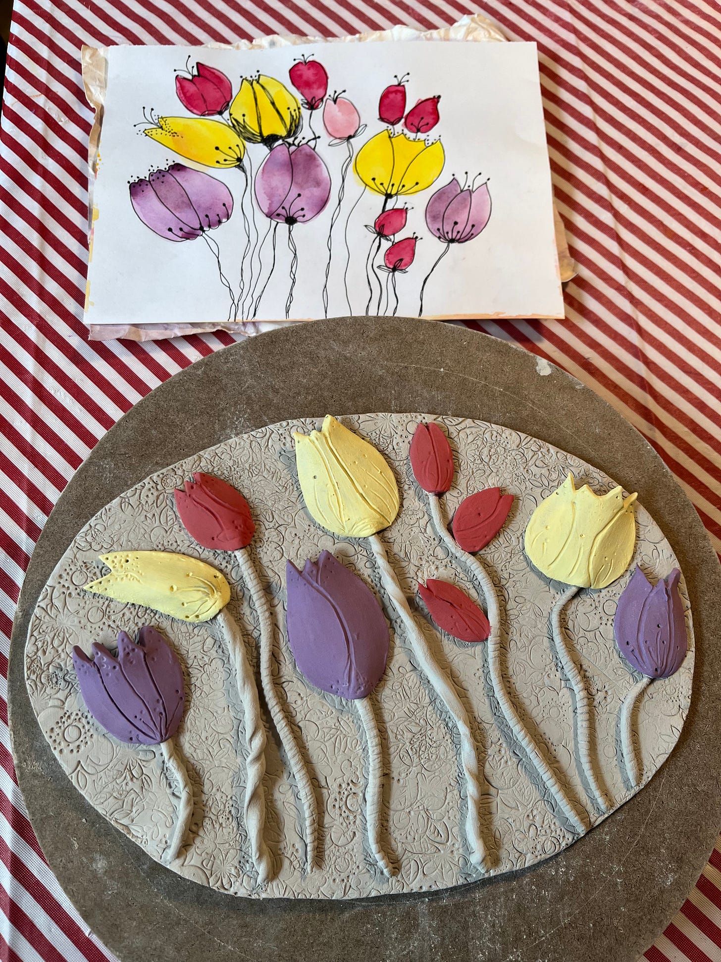 I’m also trying to learn how to combine sculptural clay elements on a base with a watercolor technique using underglazes. Will it work? I don’t know. Will I be able to show or sell them? I don’t know.