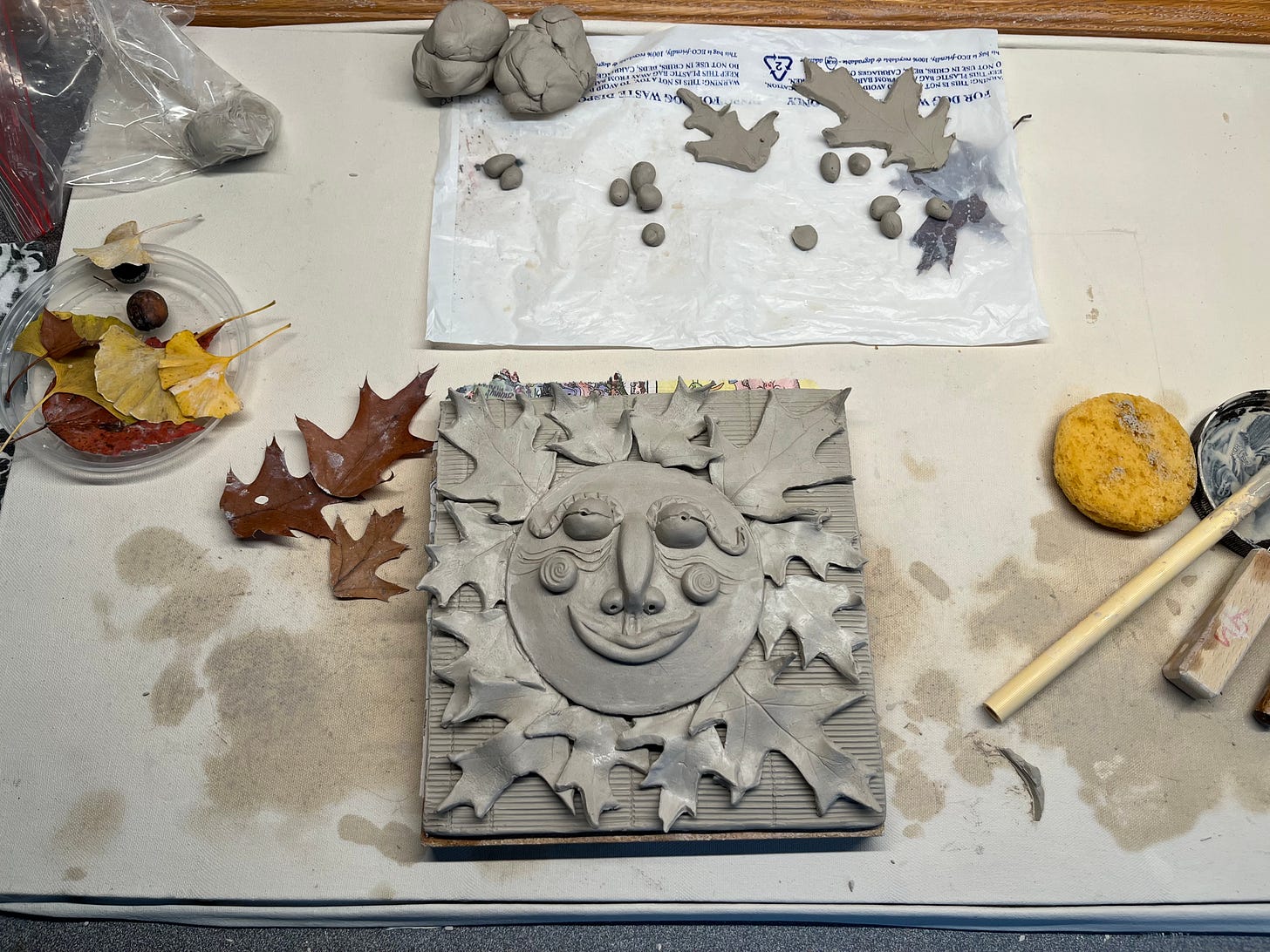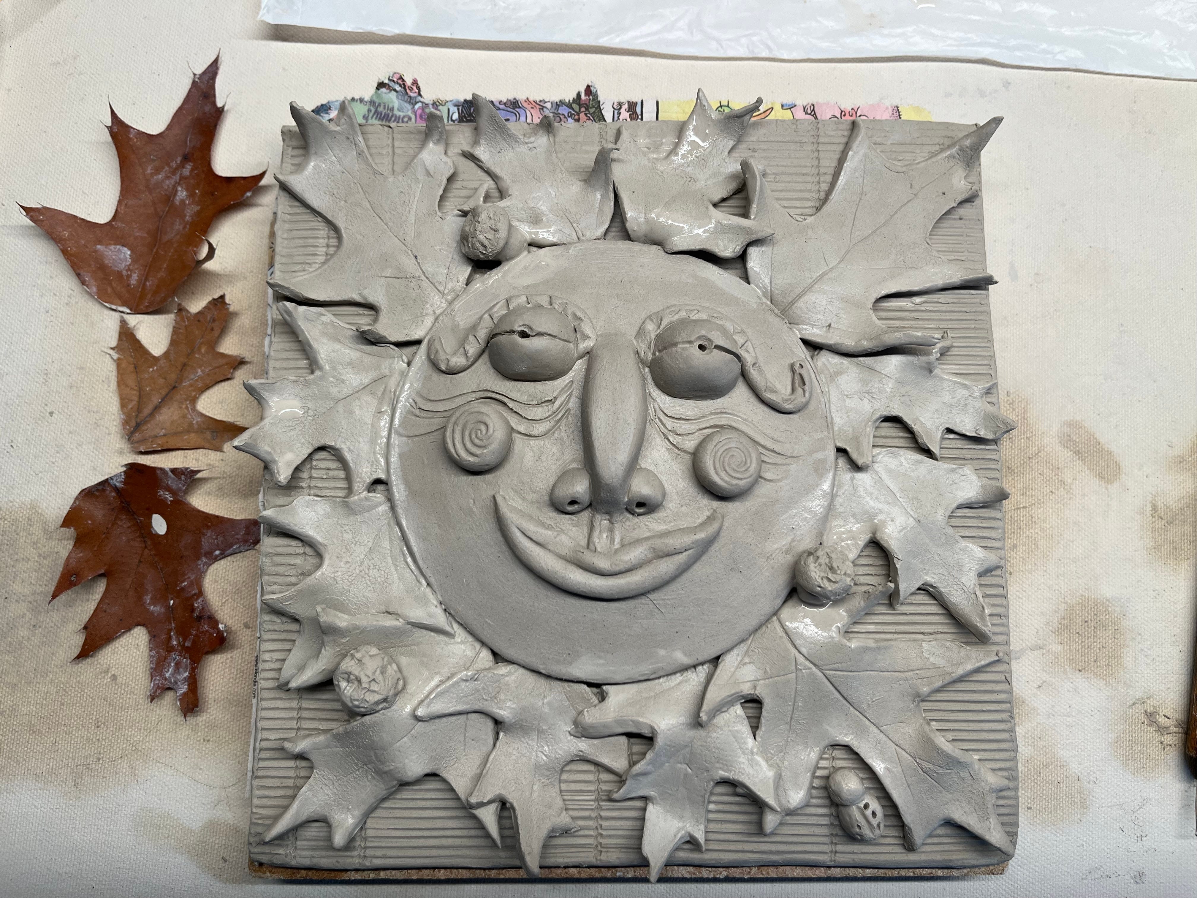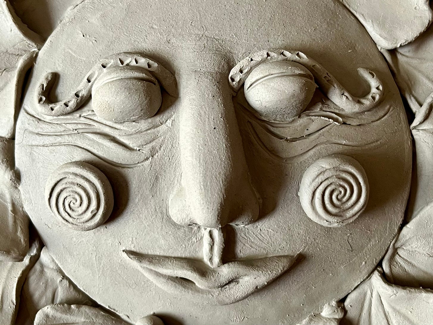 I wanted, and maybe needed, to do a relief sculpture of oak leaves. The face, like the others I’ve made, is a mystical goddess. With her eyes opening outward, a tribal like eyebrow and smiling lips, she feels to me like wisdom and love.